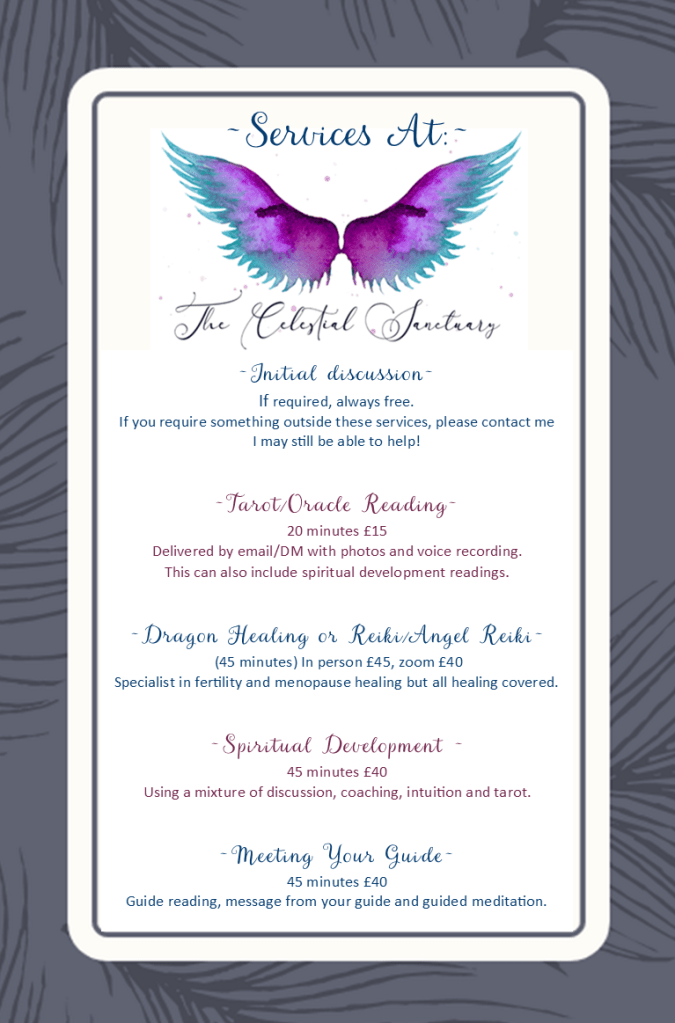 Tarot reading – All sorts of readings covered. Typically, for a 20 minute reading it will be a 5 card spread with extra oracle cards for further guidance.